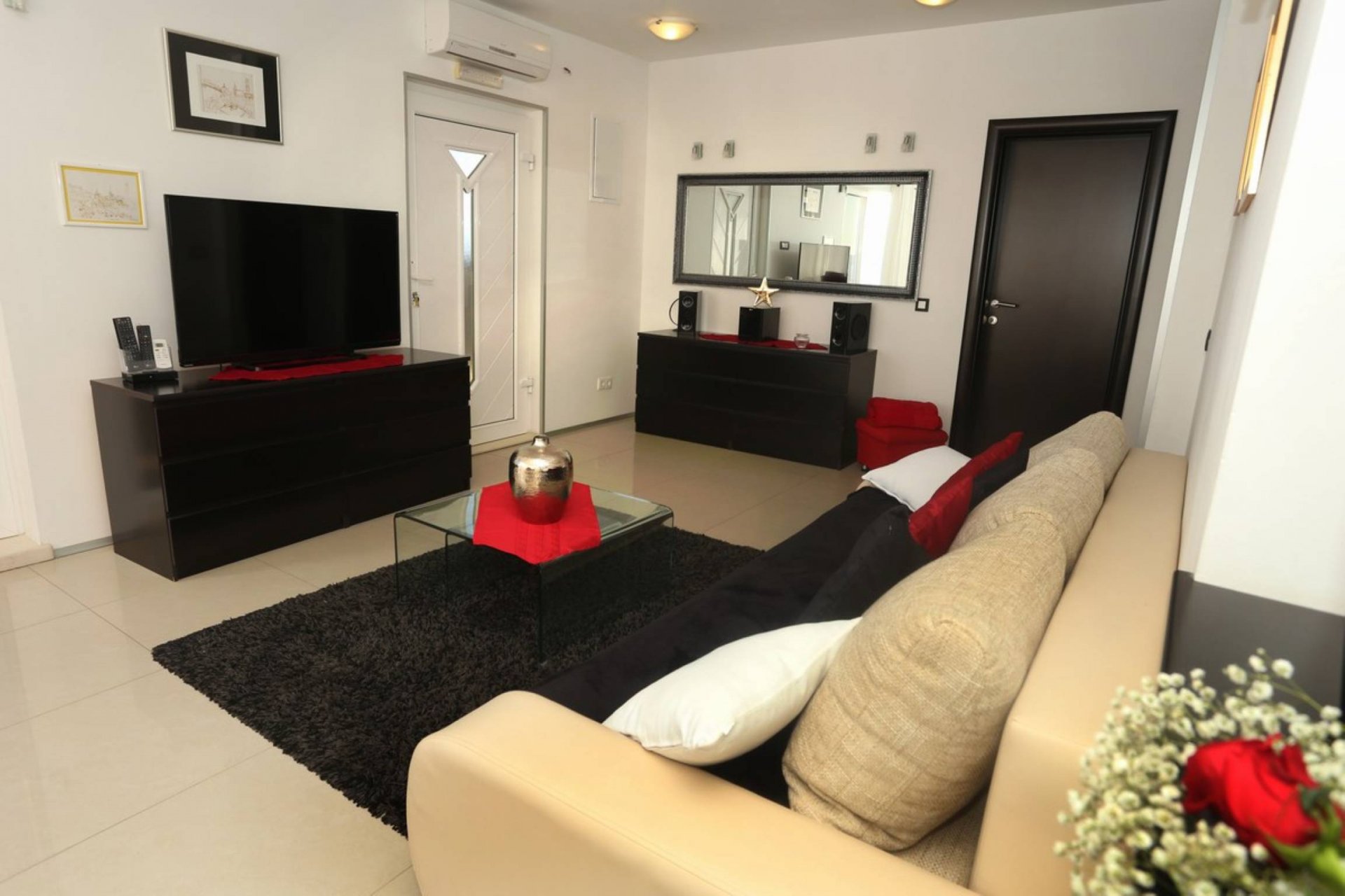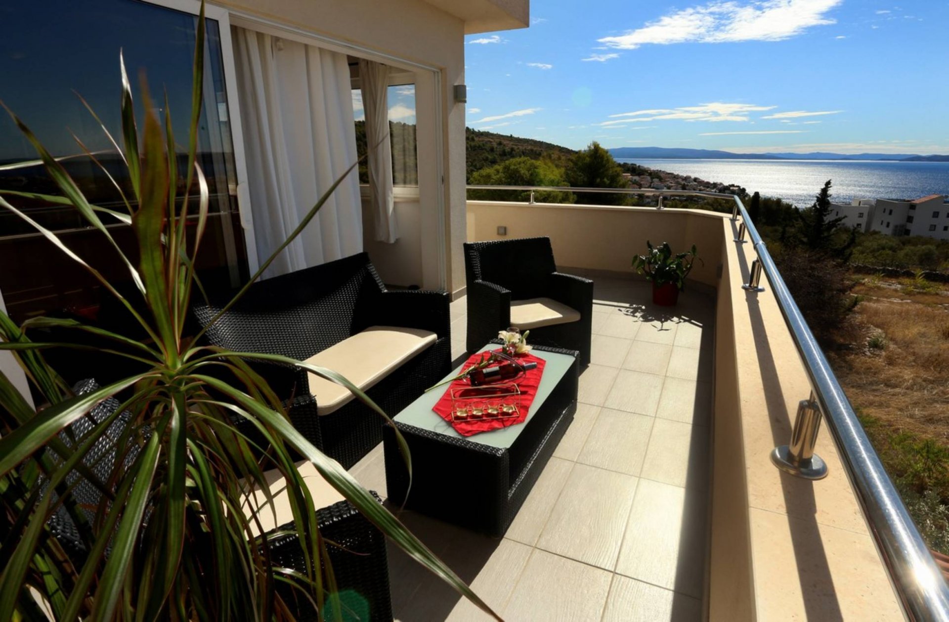 Modern apartment with two bedrooms. One bedroom with double bed and one bedroom with two single beds. Fully equipped kitchen and living room area. Outdoor covered balcony with furniture. Perfect view on Okrug bay and ideal for relaxation. Fully equipped bathroom. Outdoor private parking next to property.