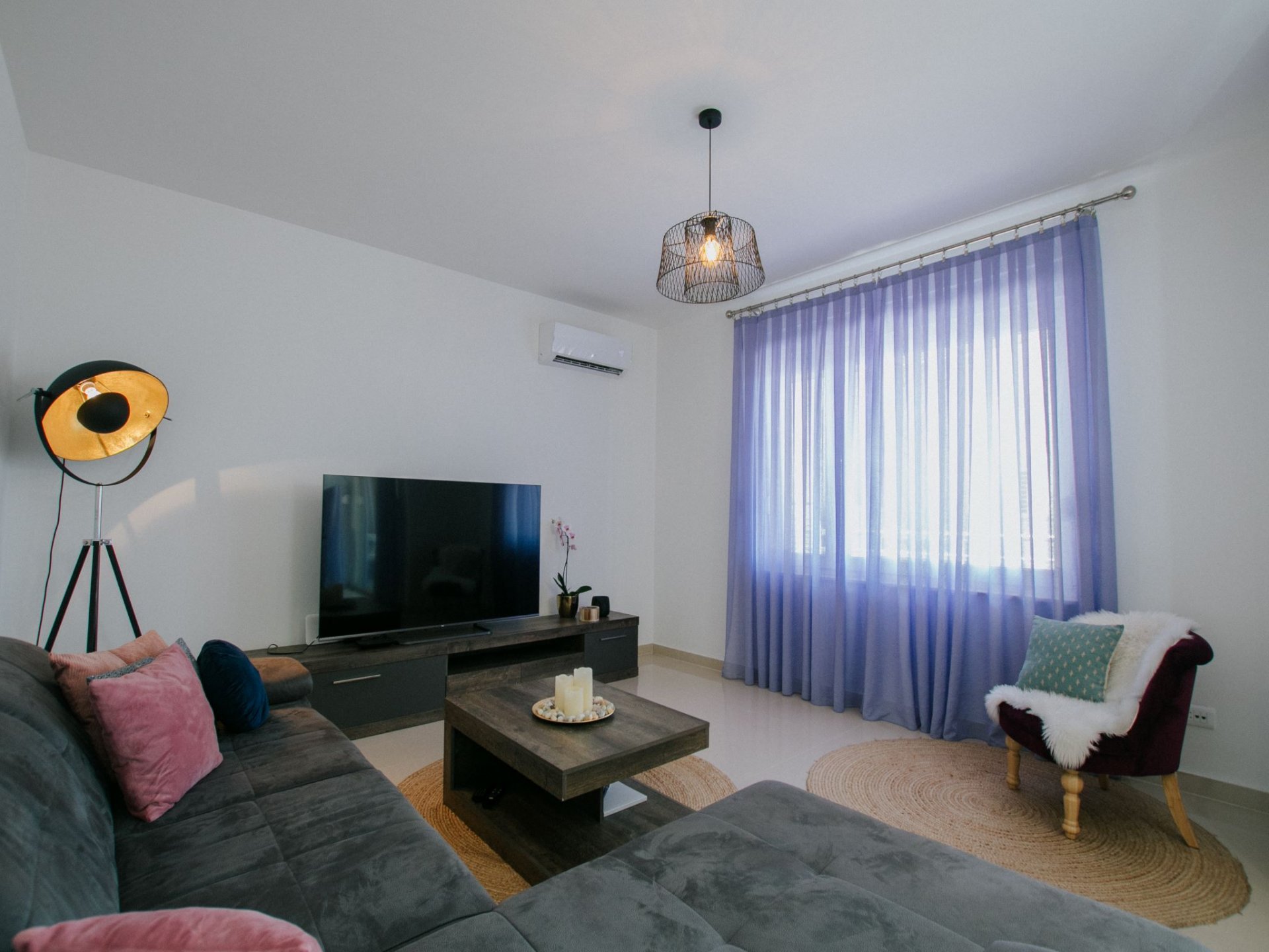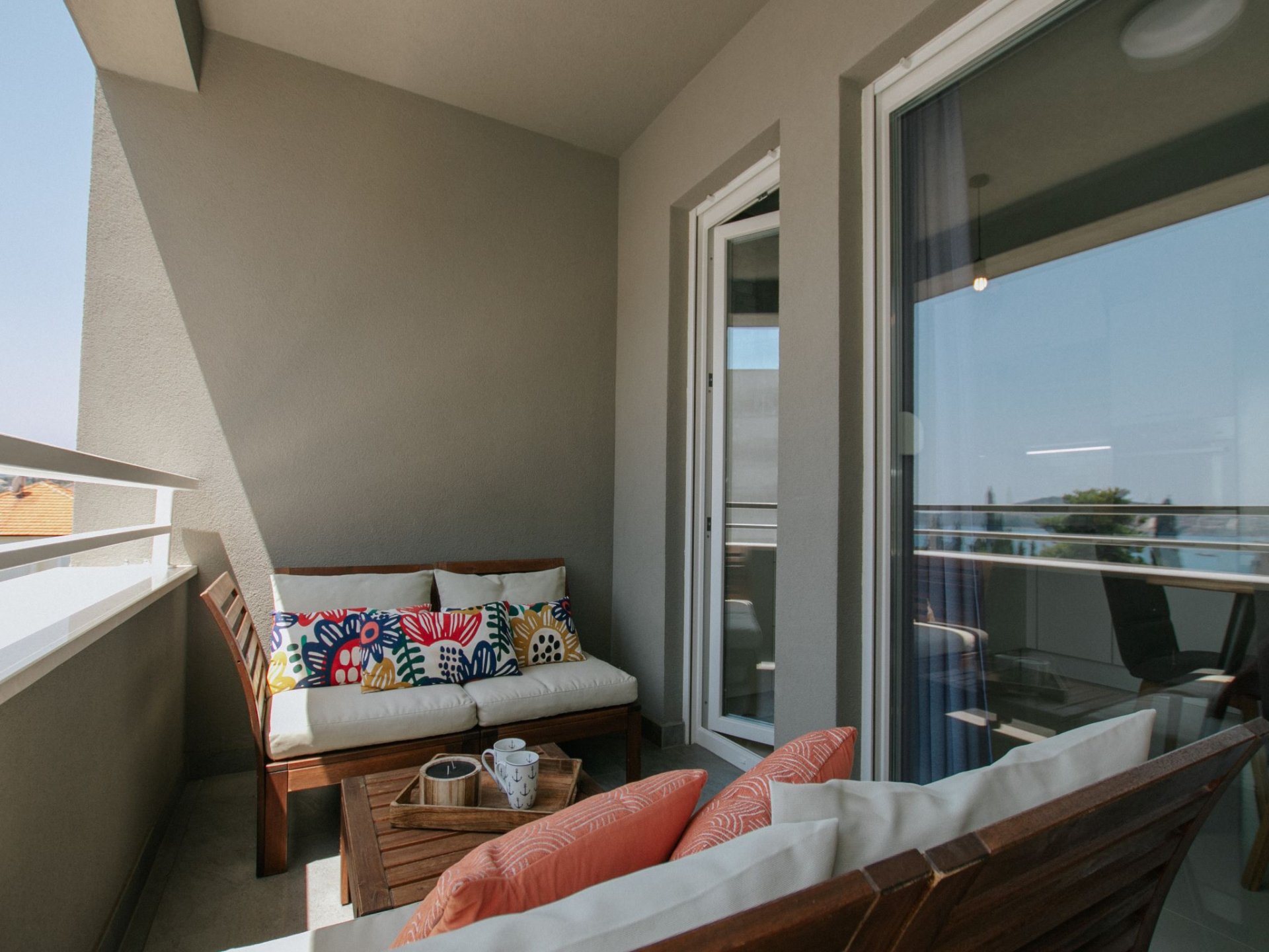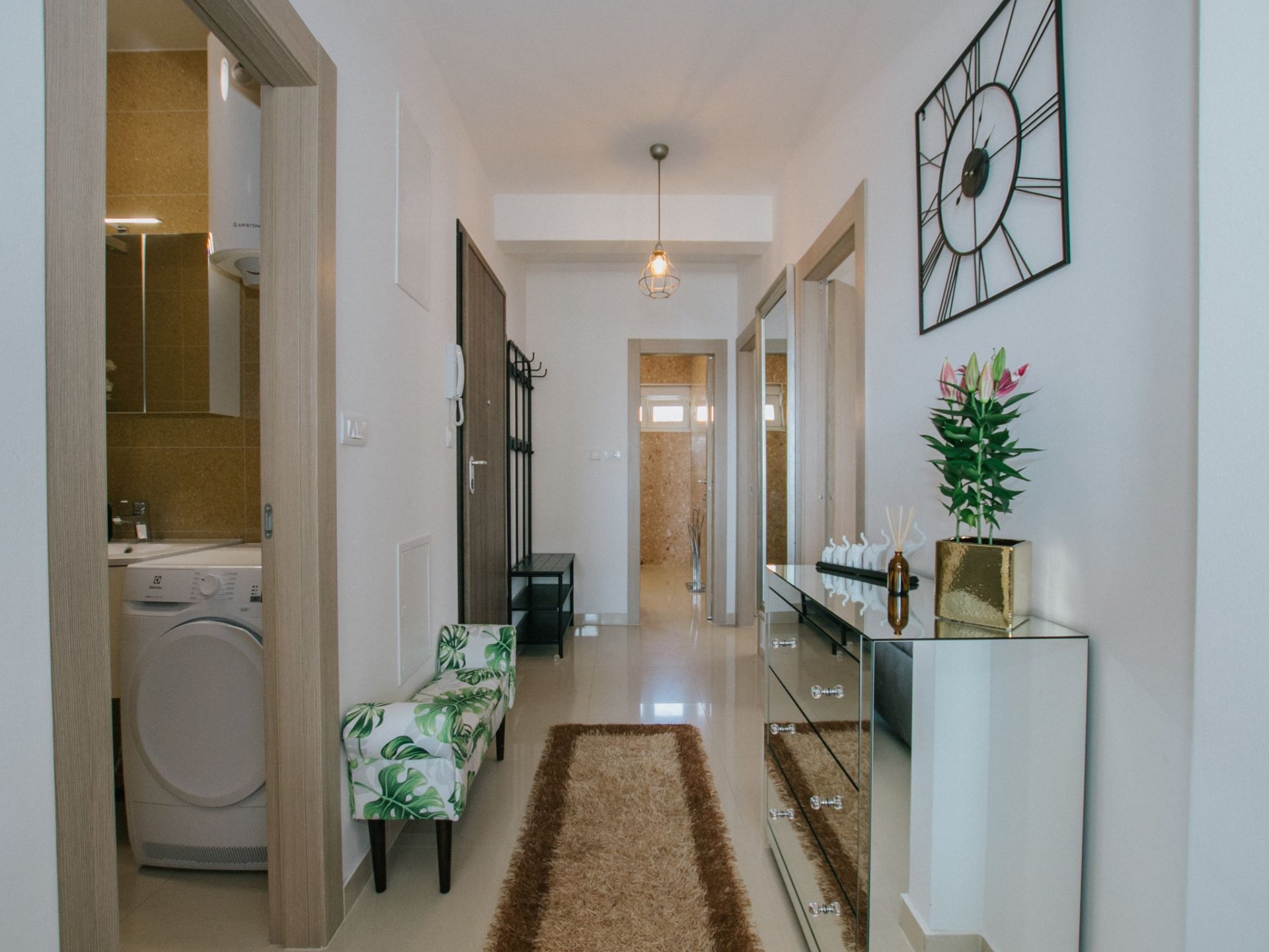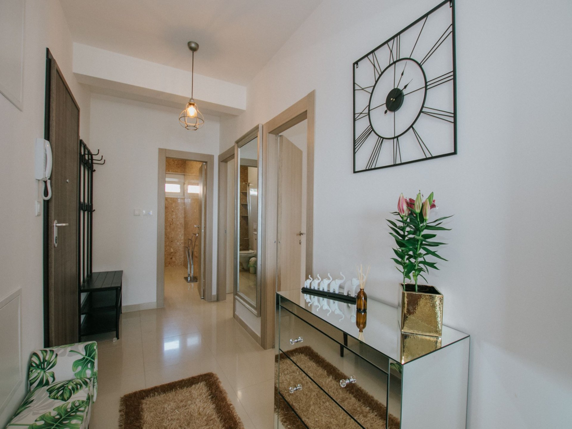 New apartment with spacious living room, fully equipped kitchen and balcony with furniture. Balcony has sea view and its covered from sun. Apartment has two bedrooms, one with double bed, and one with two single beds. Apartment has also two bathrooms equipped with shower and toilet, as well with washing machine and dryer. Apartment is on third floor of building with elevator.