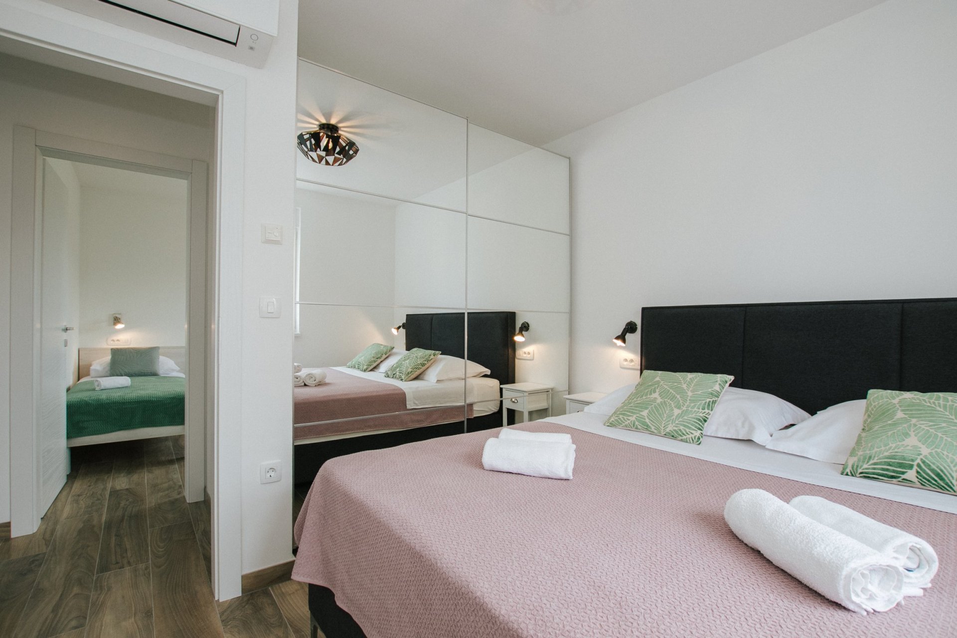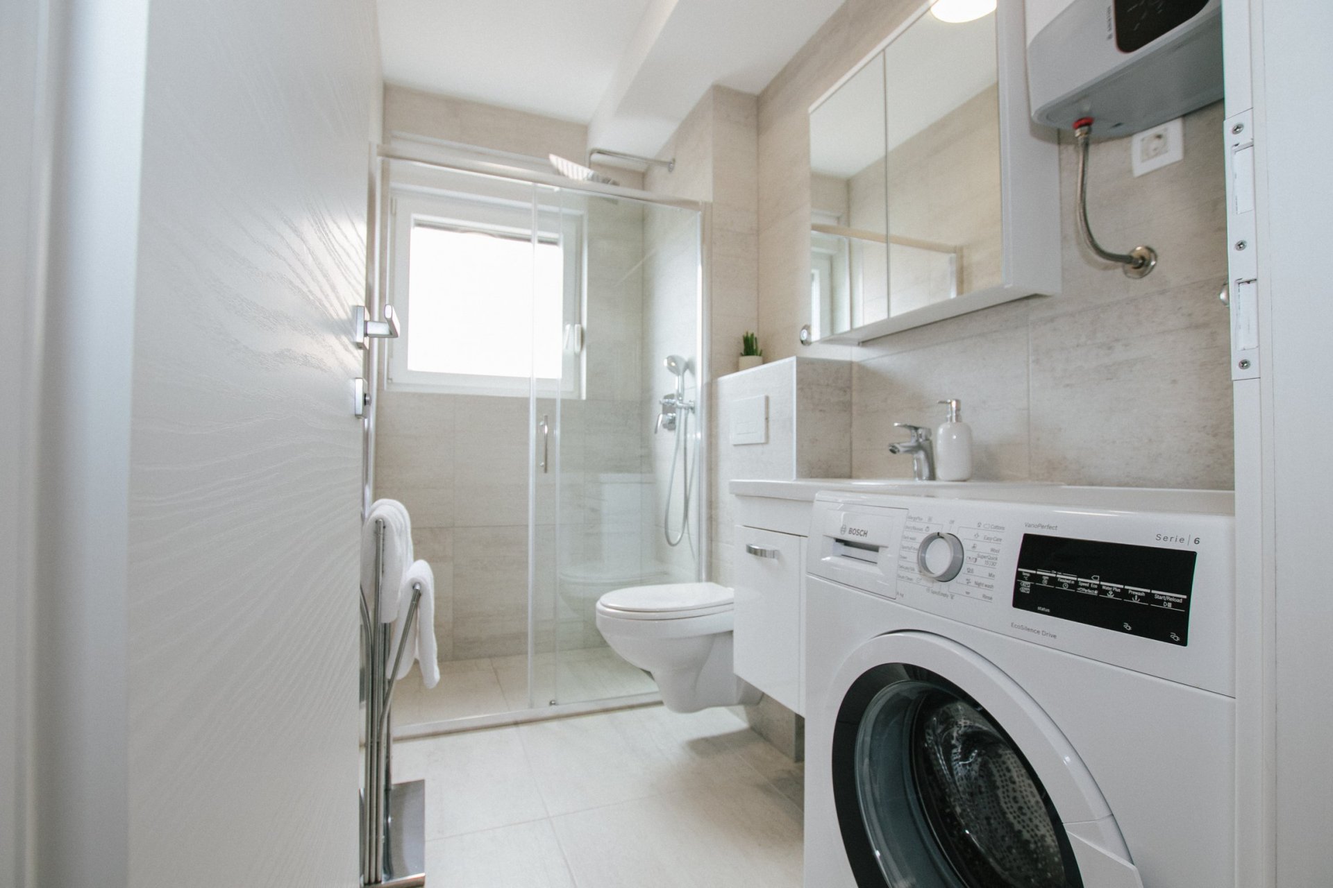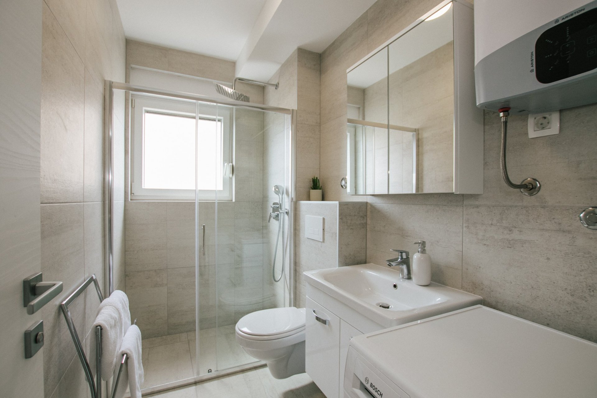 Completely new apartment located on 1st floor. It consists of two bedrooms, bathroom, kitchen with dining area and living room with entrance on covered terrace. There is one bedroom with double bed, and second bedroom with two single beds. Extra sleeping space is living room on sofa. Bathroom has shower and washing machine.
