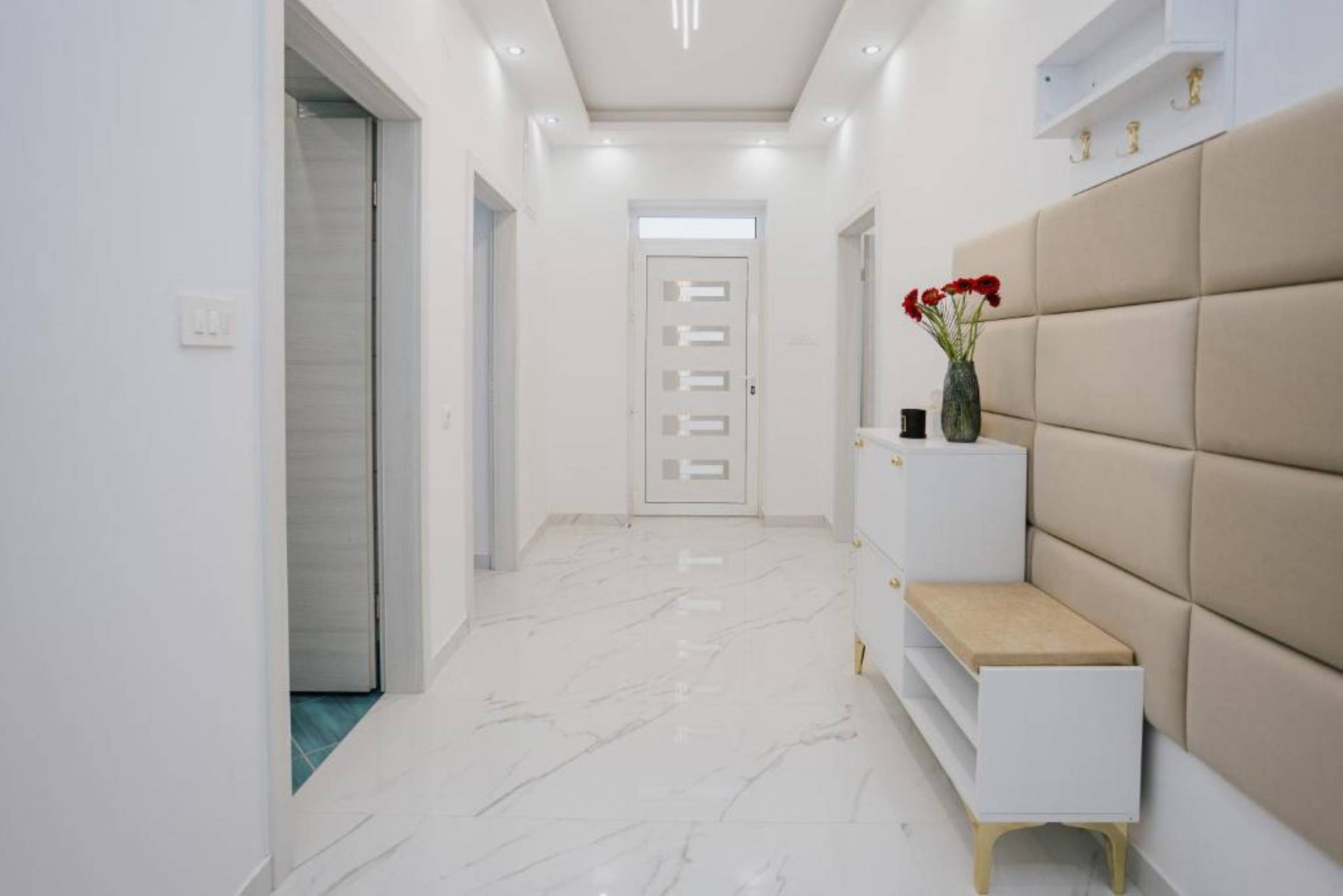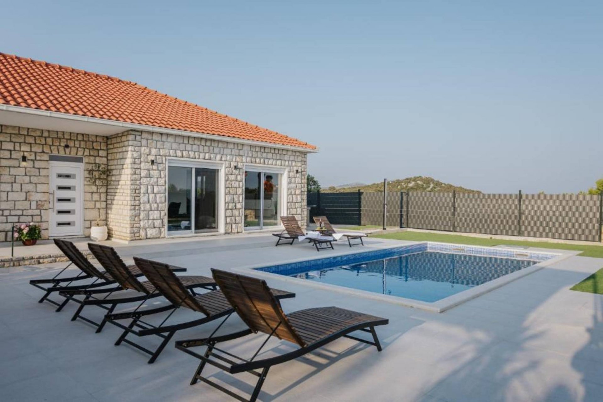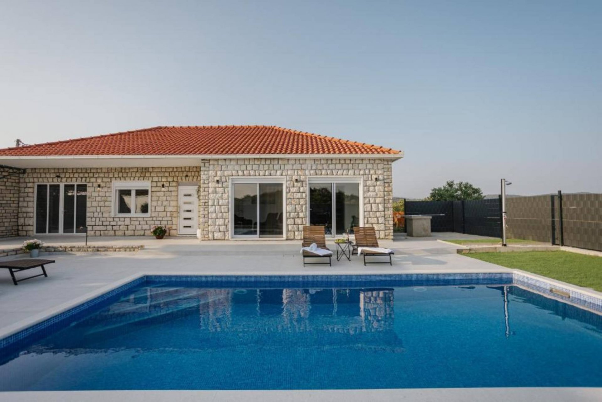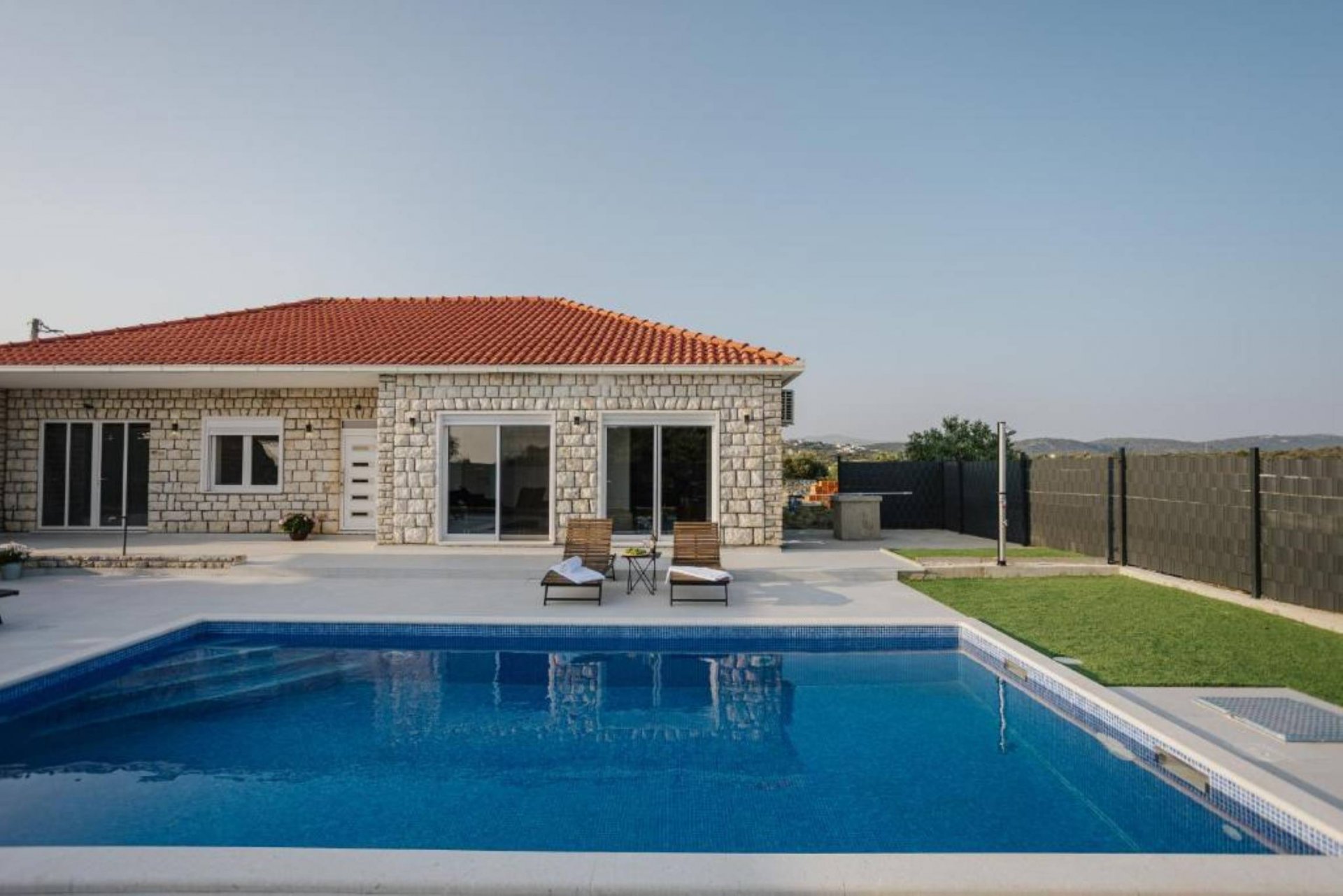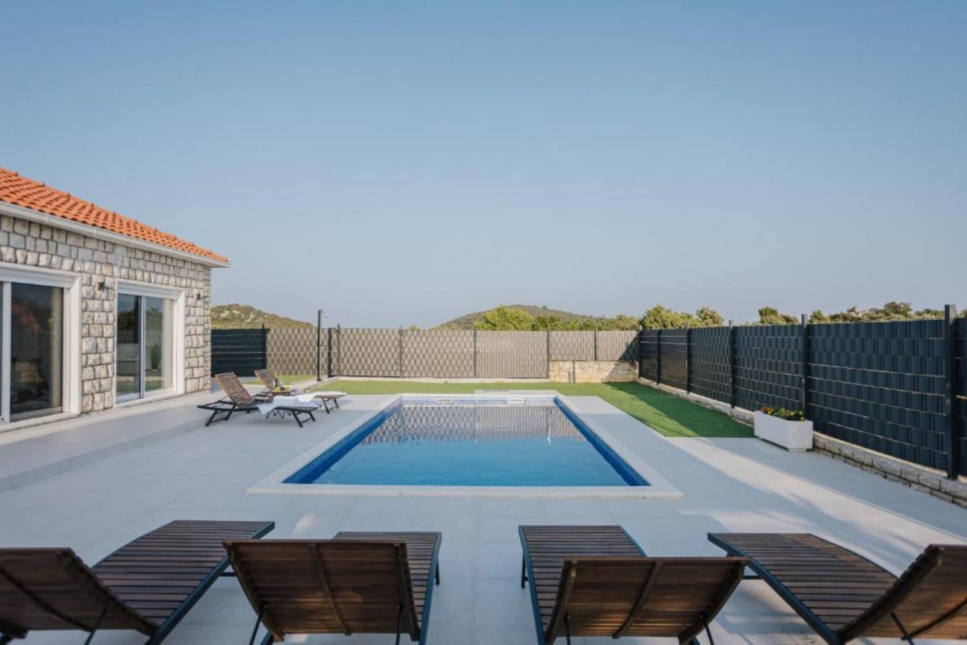 The villa offers two cozy bedrooms with double beds and a third bedroom with two single beds, making it suitable for up to six guests. There are two stylish bathrooms, both equipped with walk-in showers. The open-concept kitchen is fully equipped and flows seamlessly into the dining area, creating a bright and welcoming living space — all thoughtfully designed on one level for maximum convenience.